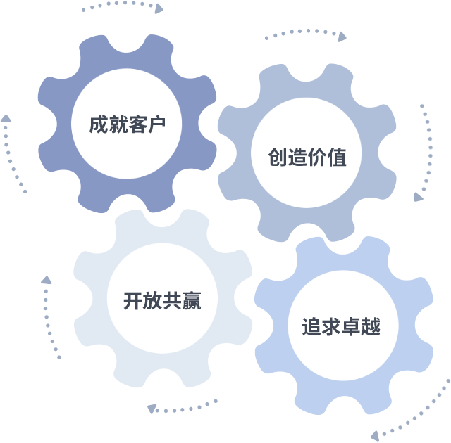 成就客户是一切决策的出发点,,,创造价值是衡量所有工作的标准,,追求卓越是我们做事做人的态度,,开放共赢是我们的格局也是最终的结果。。。价值观的齿轮环环相扣,,,推动着组织里的每个人不断向前。。。